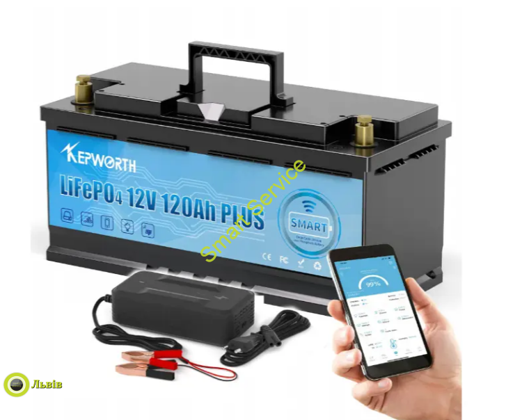 Акумулятор KEPWORTH 12V 120Ah Bluetooth Smart BMS 1536W*h LiFePO4 не потребує обслуговування, має довготривалий термін служби (6000 циклів), має вбудовану плату BMS для захисту від надмірного заряду та розряду акумулятора, надійно працюють в послідовному та паралельному з’єднанні (виробником рекомендовано до 4 штук).